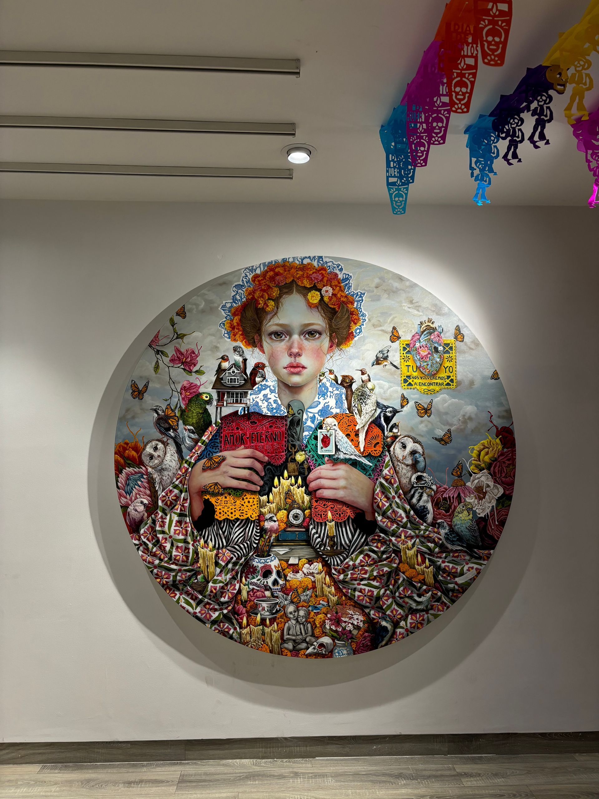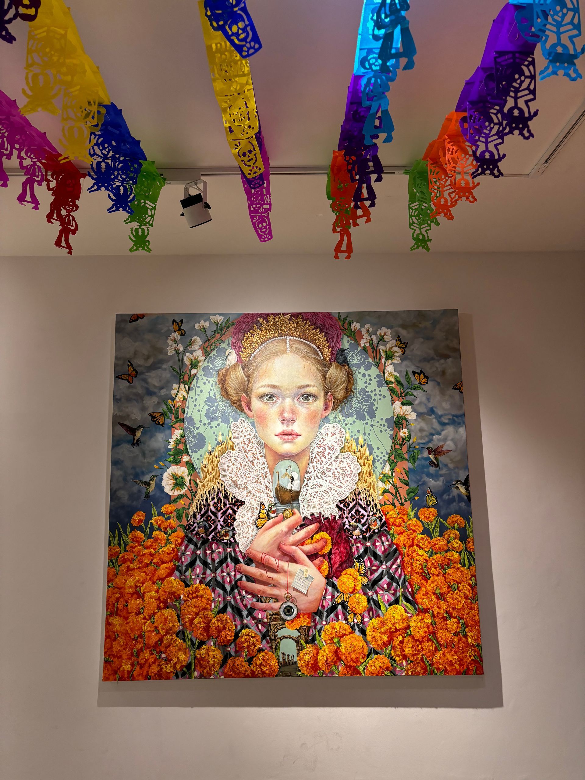 Este año, la artista lagunera Mónica Fernández se inspiró en la rica tradición mexicana del Día de Muertos para crear dos emotivos óleos de gran formato, en los que incorporó elementos representativos como la flor de cempasúchil, el papel picado y las calaveras de azúcar, entre otros.